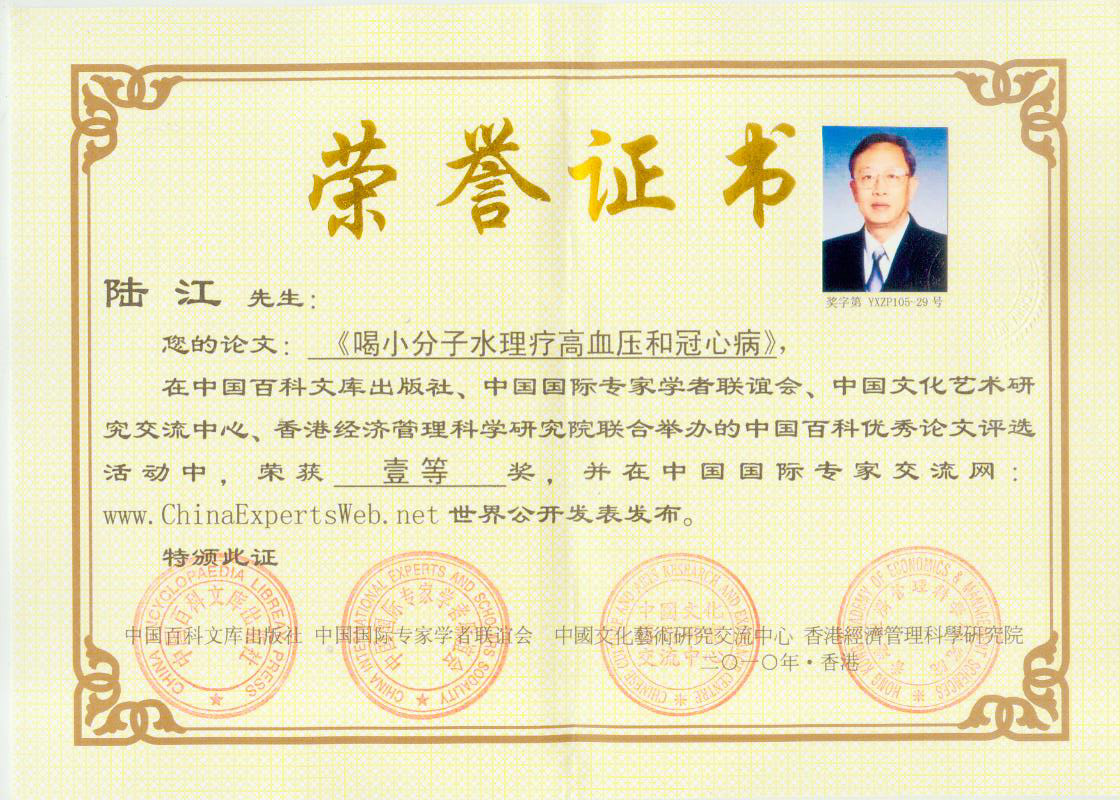 人類幾千年來患以上病癥需終生服藥,幾十年也不能治愈。可是我國南寧的高級工程師陸 江,于1990年想根治高血壓,研究發(fā)明了離子水瓶,處理出微小分子團(tuán)水供飲用,經(jīng)過醫(yī)院臨床試用和專家鑒定,1999年獲中國發(fā)明專利權(quán),產(chǎn)品于2000年投放市場后一直跟蹤調(diào)查,據(jù)全國各地用戶反饋:祛除了高低血壓、糖尿病和冠心病,并使前列腺增生、咽喉炎、鼻竇炎、慢性氣管炎、支氣管炎、矽肺病、哮喘、慢性胃炎、腸炎、慢性膽囊炎、慢性腎炎、腎衰、膀胱炎、便秘、痔瘡、風(fēng)濕性關(guān)節(jié)炎和濕疹皮炎及中風(fēng)后遺癥等病癥不藥而愈。為什么喝微小水能治20多種病?陸 江從1991年德國科學(xué)家發(fā)現(xiàn)細(xì)胞膜水通道僅為2納米獲得啟發(fā),認(rèn)為多種器官患病是因細(xì)胞脫水,不能正常代謝和分裂增殖,才使器官細(xì)胞減少致衰弱萎縮而形成細(xì)胞缺水性病癥。22年來的實(shí)踐有力地支持了“細(xì)胞脫水致病”這一重要論點(diǎn),表明喝微小水可滿足細(xì)胞的生理需求,補(bǔ)水就能祛病,是生命科學(xué)新亮點(diǎn)。